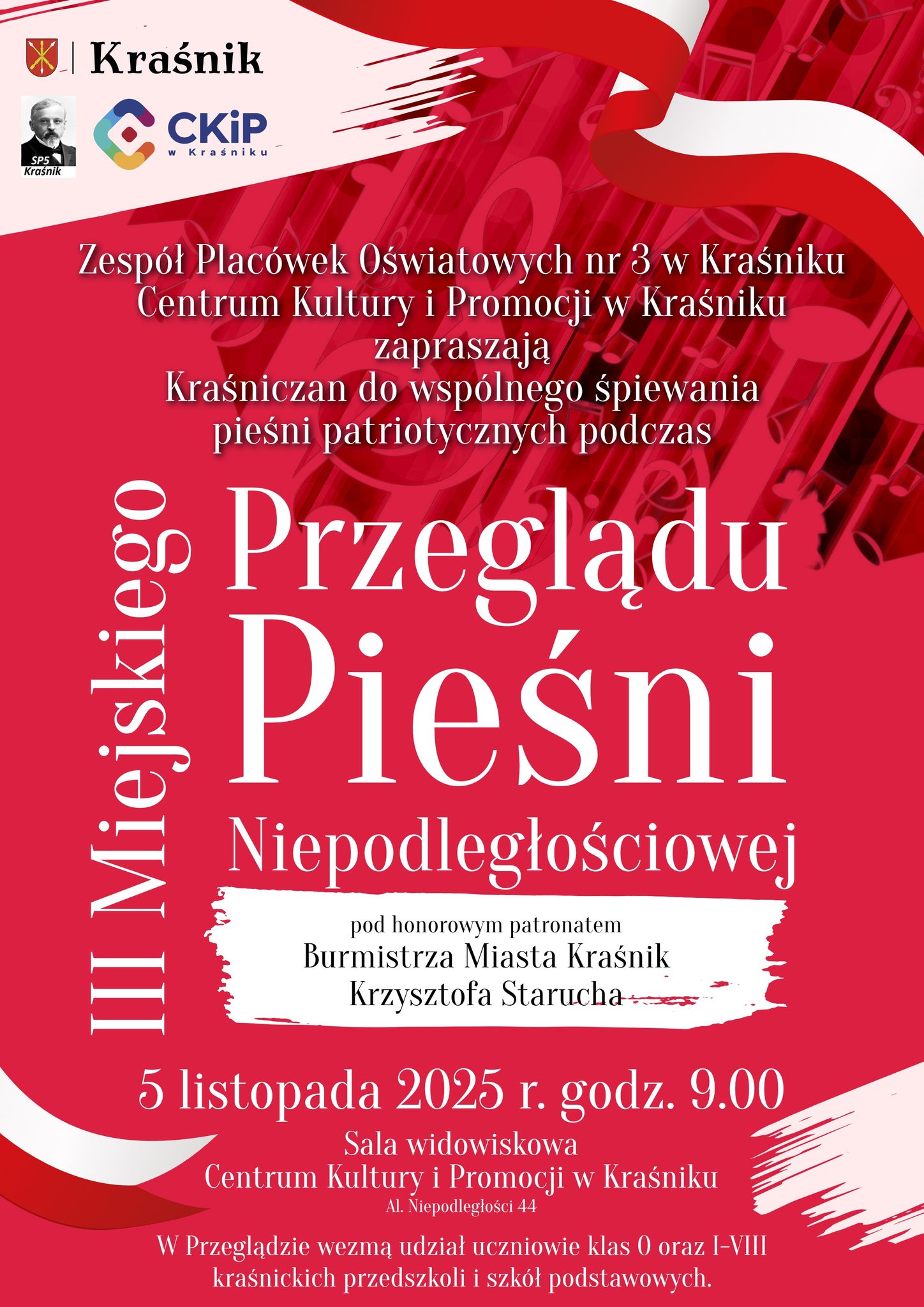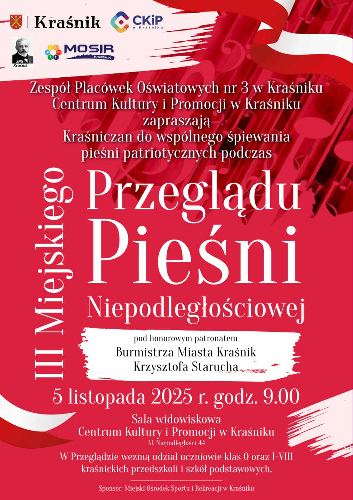 5 listopada zapraszamy do Centrum Kultury i Promocji w Kraśniku na wyjątkowe wydarzenie w duchu patriotyzmu i muzyki – III Miejski Przegląd Pieśni Niepodległościowej w wykonaniu uczniów kraśnickich szkół podstawowych.